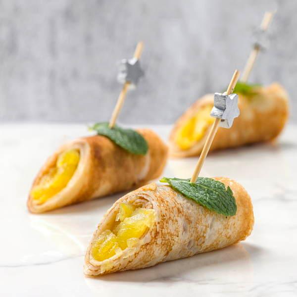 Представьте себе невесомые, золотистые блинчики, тающие во рту, с сочной яблочной начинкой, где каждая нота вкуса раскрывается постепенно. Это настоящее гастрономическое путешествие, где нежность теста встречается с сладостью яблок, а свежесть мяты добавляет блюду особое очарование.