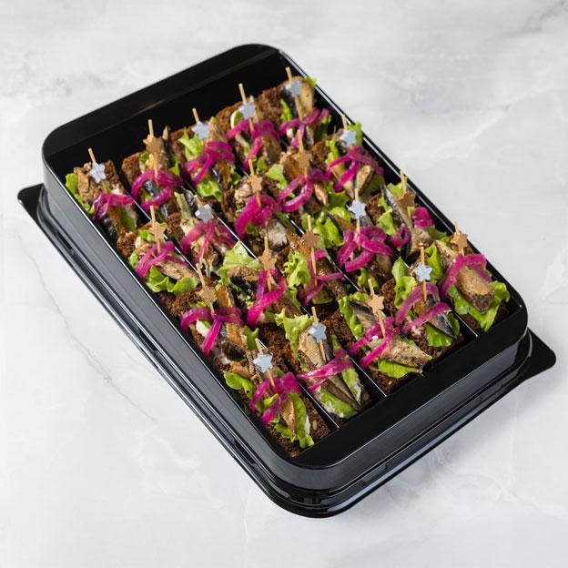 Идеальное сочетание нежных консервированных шпрот и пикантного хрена на ароматном ржаном хлебе. Каждый укус подарит вам гармонию текстур и насыщенных морских нот, дополненных освежающим салатом и сладковатым маринованным луком.