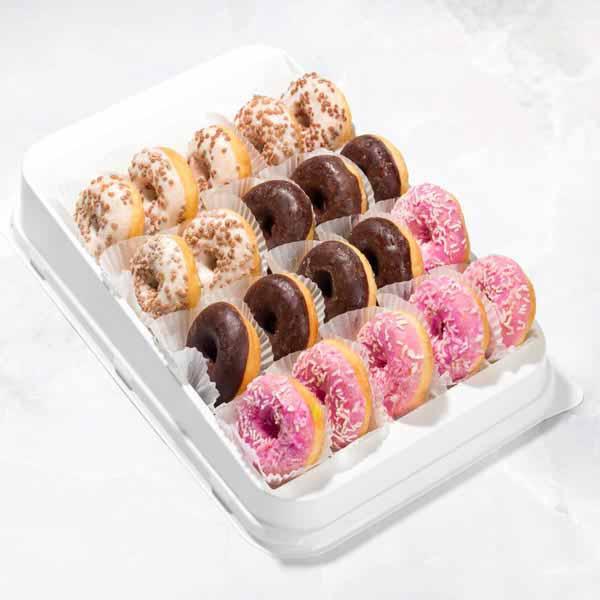 Мини-пончик шоколадный — нежное тесто, покрытое богатой шоколадной глазурью, подарит вам мгновения истинного блаженства. Каждый укус словно обнимает вас теплом и уютом, заставляя забыть о заботах. Мини-пончик клубничный — яркий и свежий, с легкой клубничной глазурью и нежной начинкой. Этот пончик напомнит вам о летних днях и радости, когда солнце светит ярче. Идеальный выбор для любителей фруктовых десертов! Мини-пончик карамельный — сладкое искушение с насыщенной карамельной глазурью, которая тает во рту. Он станет настоящим лакомством для всех, кто ценит богатый вкус и аромат карамели.