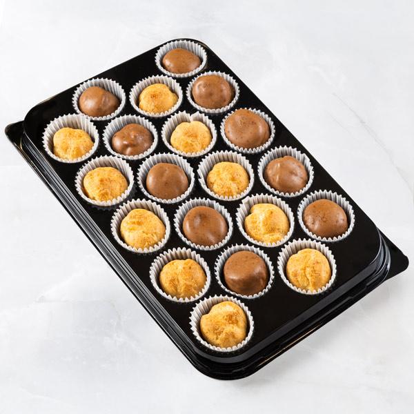 Разнообразие вкусов в одном наборе: воздушные профитроли со сливочным кремом, шоколадные с солёной карамелью — изысканная сладкая композиция для любого праздника.
